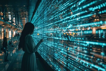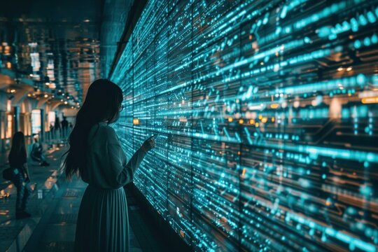 Back view of a woman touching a hightech, glowing digital wall panel in a modern setting
