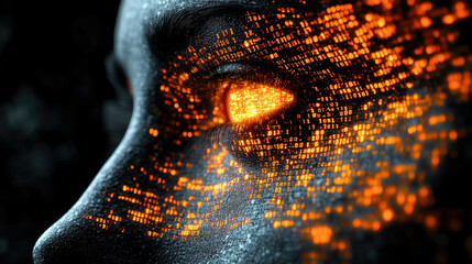 A digital face with glowing data streams, symbolizing the intersection of technology and human identity in a futuristic setting.