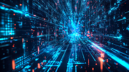 Futuristic digital tunnel with vibrant lights and data streams intersecting