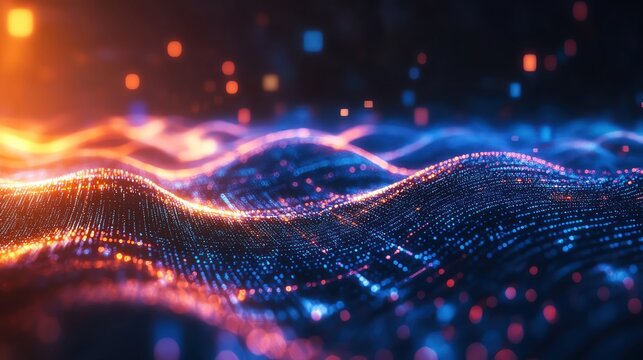 Smooth curves of glowing nodes and lines represent digital signals moving through a virtual environment, evoking innovation and advanced technology.