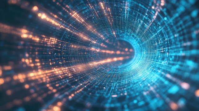 Digital information stream moves rapidly through a dark, abstract environment