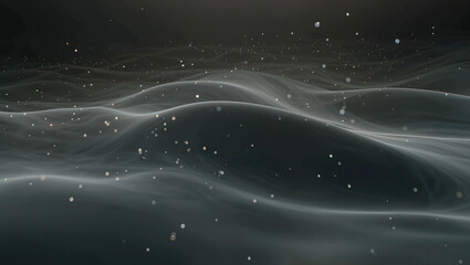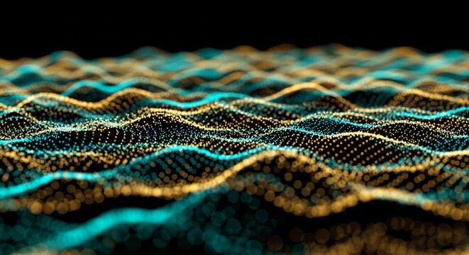 Abstract Waves of Digital Data: Digital data visualization showcasing undulating waves of interconnected particles in shades of teal and gold, against a black backdrop.