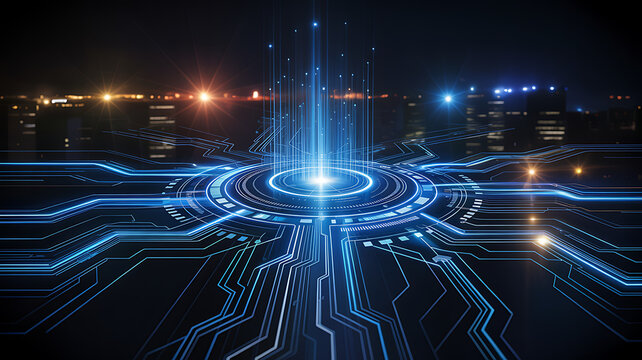 An abstract digital interface with glowing lights and data streams superimposed over an out-of-focus city street at night.