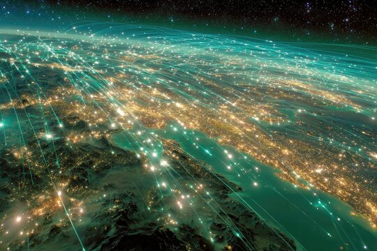 A glowing earth with city lights and data streams over north america, symbolizing global communication, technology, and interconnectedness