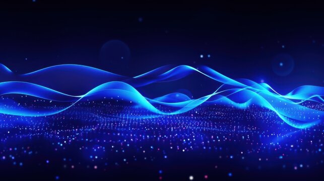 Ethereal blue waves of data flow seamlessly against a dark backdrop, representing the digital era's connectivity and technology.