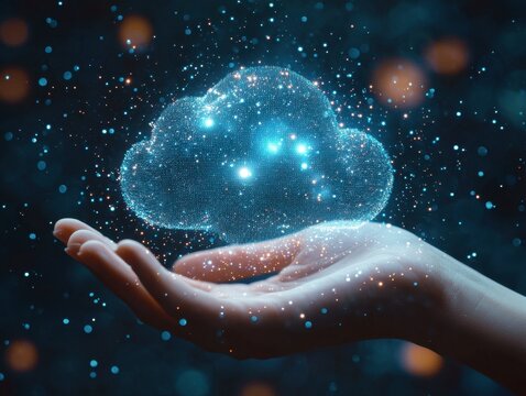 In the palm of a hand, a glowing, holographic cloud hovers, representing the power and connectivity of modern IoT devices The data visualization streams seamlessly, connecting the device to remote