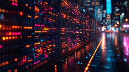 Digital Cityscape: A mesmerizing cityscape bathed in the soft glow of neon lights, with streams of digital data flowing seamlessly across the frame, epitomizing modern technology