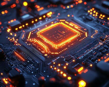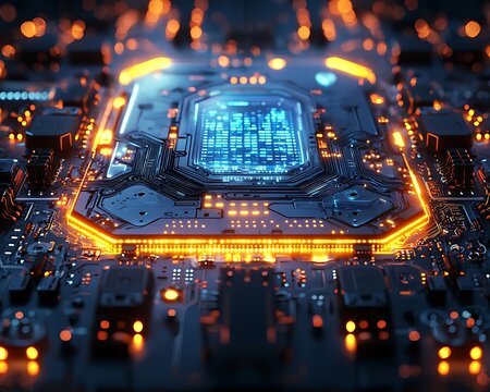 A dark-mode futuristic circuit board with a glowing blue cybernetic interface, resembling an