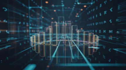 Digital data streams glow in a dark space with blue binary code elements floating above the ground