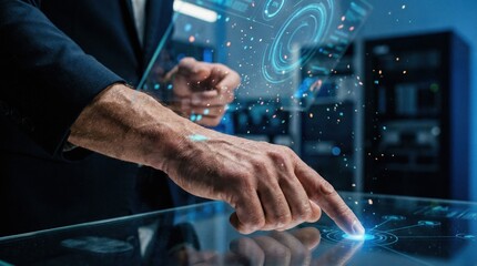 Man touching a futuristic interface with glowing data streams.