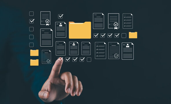 Document management concept, Businessman check electronic documents on digital documents on virtual screen Document Management System and process automation to efficiently document paperless operate