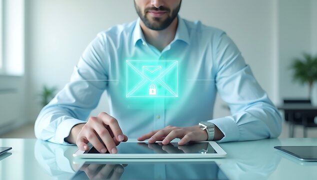 Digital Communication Security Man Using Tablet with Encrypted Email Icon Overlay
