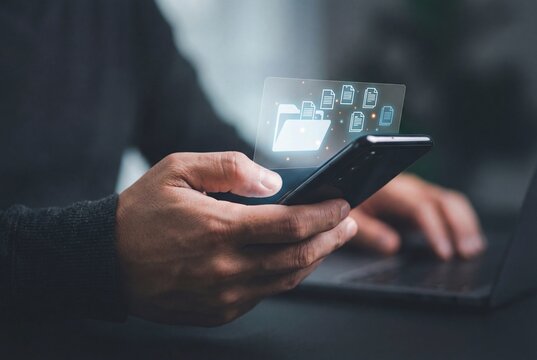Businessman holding smartphone with virtual folder and digital documents for data management