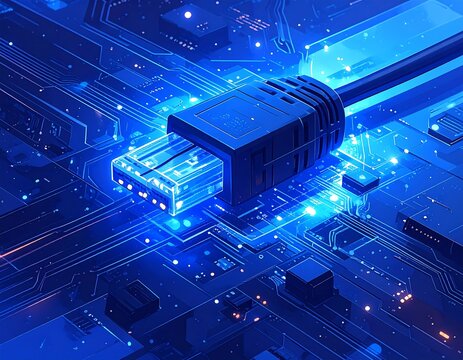 Close-up view of an illuminated USB cable connecting circuit board