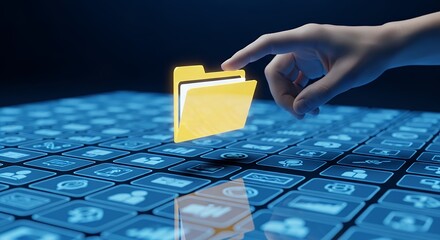 Digital File Management Concept Hand Selecting Glowing Folder on Futuristic Blue Interface for Data Storage and Organization