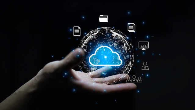 hand holding icon cloud computing network and icon connection data information in hand. Cloud computing and technology concept