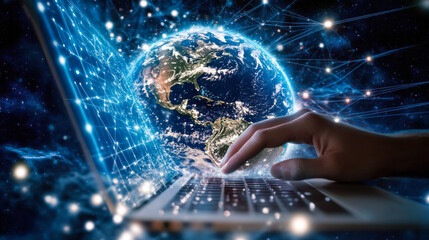 Exploring digital connections with a hand on a laptop as the Earth glows in a network of data