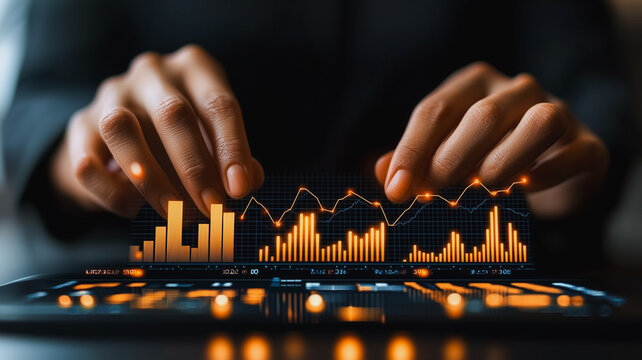 Data-Driven Growth: Close-up of hands interacting with a glowing digital tablet, showcasing a dynamic graph, symbolizing the power of data analytics for strategic decisions and success in business.