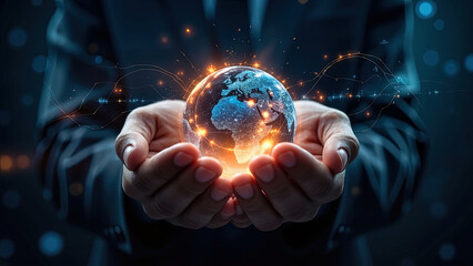 Human hands gently holding a glowing digital earth, symbolizing global data technology, innovation, science, digital transformation, worldwide connectivity, and artificial intelligence.