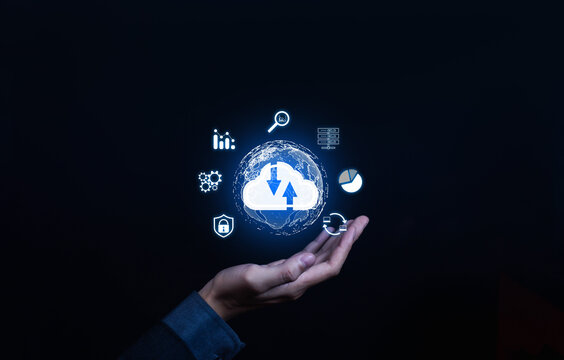 Business hand holding cloud computing icon with data analytics and technology symbols. Concept of digital storage, network connection, cyber security, and online data management in modern business.