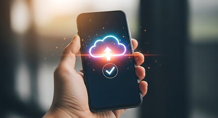 A hand holding a smartphone displaying a cloud upload icon with a checkmark on the screen