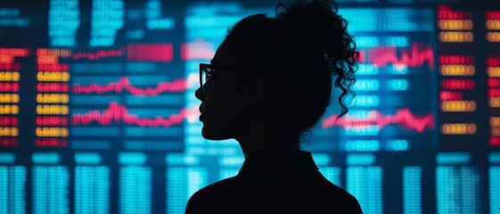 Retail investment accessibility. Silhouette of a woman against a vibrant financial data display.