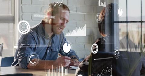 Business team collaborating over holographic data dashboard with futuristic circular ui