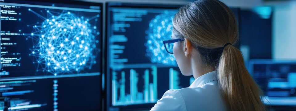 Researchers analyze data in a modern laboratory with glowing screens and blue light highlighting their focused work