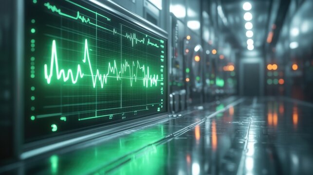 Tracking volatile data with green monitor in a server room conveying stability and consistent