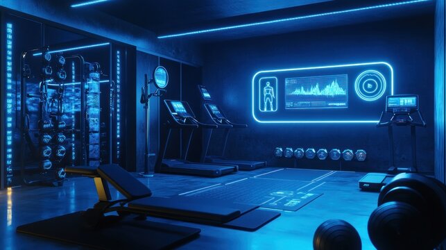Futuristic gym with neon illumination features a holographic male figure standing on a digital grid. This modern fitness environment showcases advanced technology and virtual training concepts.