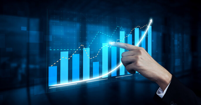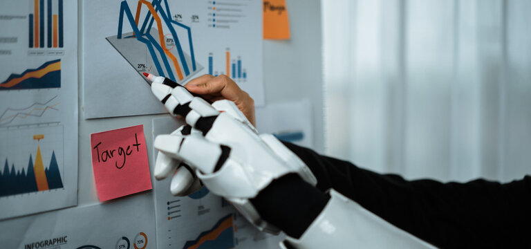 A futuristic robotic hand interacts with charts and graphs in a modern office setting, showcasing the blend of technology and business analysis.Noogenesis