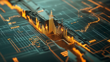 Futuristic 3D cityscape with glowing orange skyscrapers on a digital blueprint, resembling a modern city integrated into technology-themed architecture or data visualization.