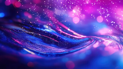 Dynamic flowing wave of glittering particles and vibrant light streaks creating an abstract background, symbolizing data flow, digital connection, and technological innovation