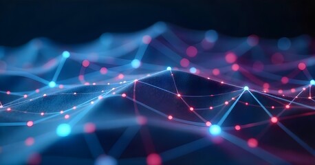 Abstract blue and pink grid with interconnected lines and dots forming a network, creating a futuristic and technological landscape against a dark background