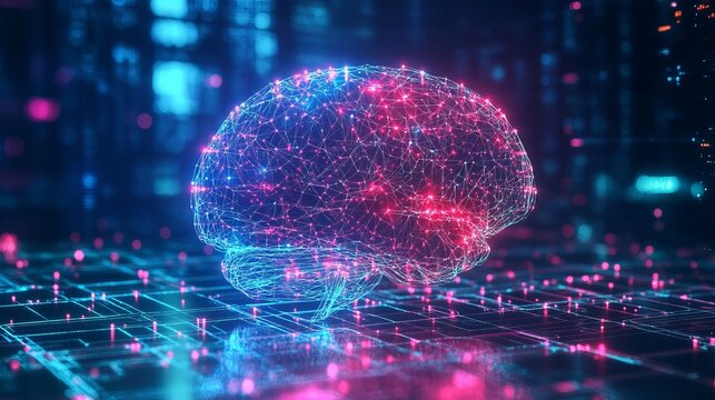 A futuristic digital illustration of a human brain with neon pink and blue lights on a grid background