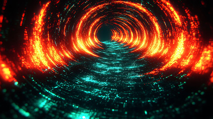 Stunning abstract image of a swirling, luminous tunnel in vibrant orange and teal.  Perfect for tech, science fiction, or data visualization projects.