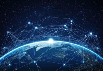 Earth glowing with streaming digital data arc and global network over night-side horizon