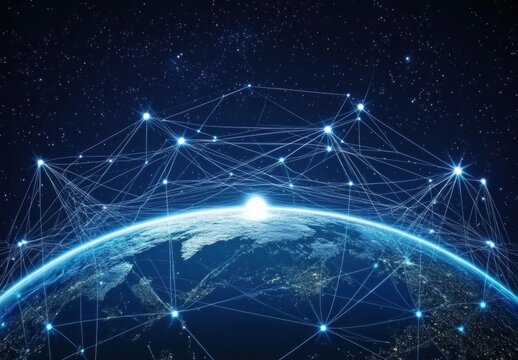 Digital Global Network Connection Over Earth at Night with Bright Lights and Stars Representing Communication and Technological Advancement in Space