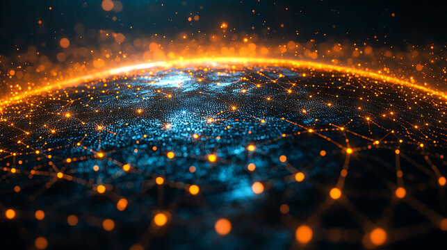 A stunning digital visualization of a connected world, showcasing bright orange and blue lights over a globe with network links.