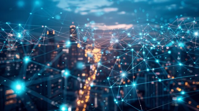 An aerial night view of a glowing city with connected lines