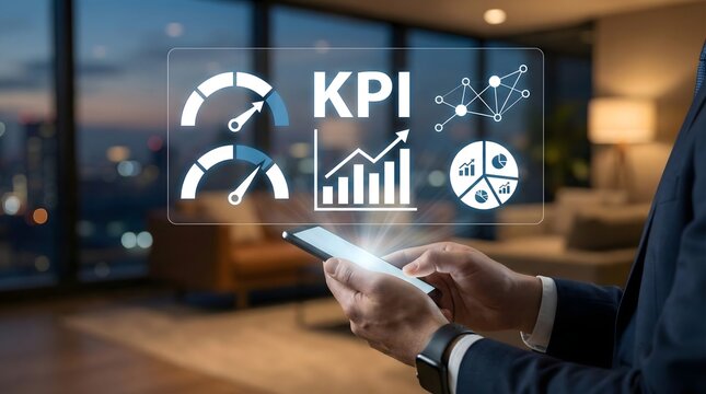 Businessman using smartphone with glowing KPI hologram overlay,key performance indicator gauges and charts,business management and strategy analysis,digital metrics visualization in office