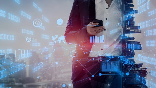 Businessman using smartphone with abstract financial charts overlay, modern design style, cityscape background, concept of investment and analytics