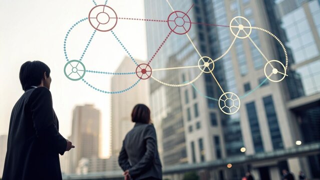Two professionals observe a digital network overlay against a cityscape, illustrating the connection between technology and urban life.