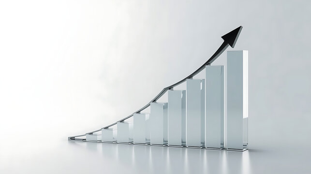 Silver 3D bar graph with floating data bars showing analytics and financial growth in modern digital interface