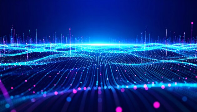 Futuristic neon lit 3d grid with digital data streams