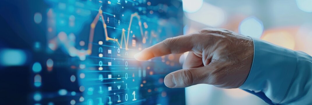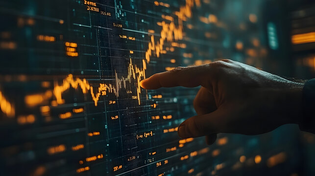 Close-up of hand interacting with futuristic digital financial data charts and analytics interface glowing in blue and orange colors on touchscreen panel