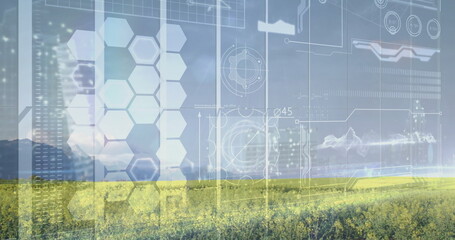 Futuristic data interface in digital hexagonal grid