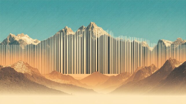 Surreal landscape with mountains overlaid by barcode strips, suggesting a digital perspective on nature. Soft colors and texture create depth