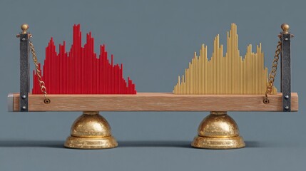 Balanced Seesaw with Red and Gold Sound Wave Graphs on Wooden Platform in Studio with Gray Background
