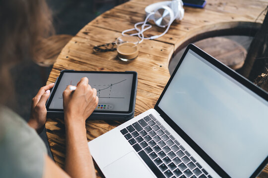 Close-up of creative woman sketching abstract graph on digital tablet, combining artistic expression and data visualization next to laptop and coffee in relaxed workspace